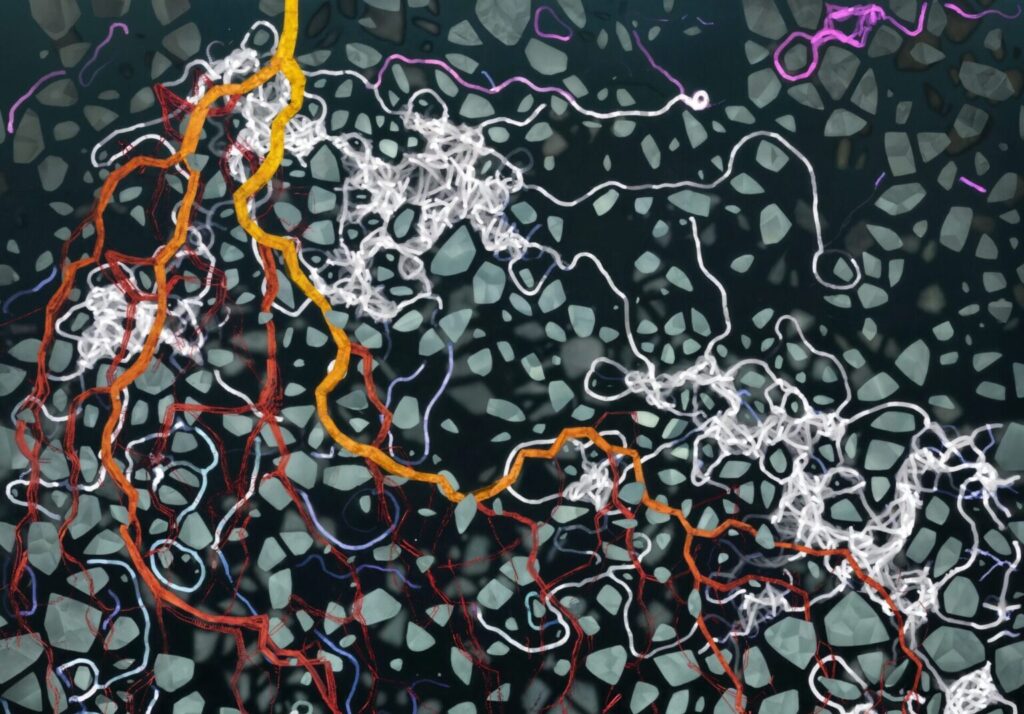 Slime Mold Simulations draw on a different growth principle: they mimic the behavior of slime molds, which respond to stimuli as a swarm-like system. A network of virtual „particles“ moves through space, leaves a trail, and orients itself toward existing trails and food sources. Where many particles travel, the trail is reinforced — the network is stabilized. Less-used connections dissolve over time. In this way, finely branched, efficient conductive structures emerge that are reminiscent of fungal networks, blood vessels, or transport grids.